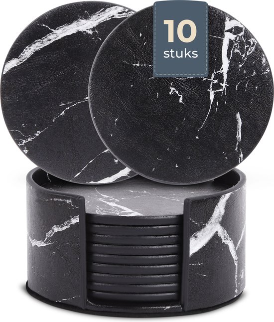 Sous-verres de verre Castagnola en similicuir avec support - Sous-verres de verre pour Verres - Design de Sous-verres - Ensemble de sous-verres - Sous-verres de verre - Similicuir - Sous-verres en cuir - Set de 10 - Zwart/ Wit