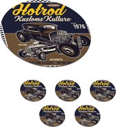 Marron avec image bleue et jaune d'une voiture ancienne. L'image montre deux soi-disant « hotrods ».Spécifications produit