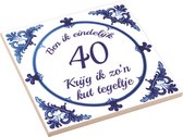 La tuile sort avec le texte 40 ans est une tuile unique à accrocher au mur. Ce carreau est fait de céramique et a une finition de haute qualité. Il a une belle couleur blanche et une bordure de Delft Blauw avec le texte "Ben enfin 40 ans, je reçois une telle tuile de con". Un cadeau unique avec humour. Vous recevrez le carreau emballé dans de la mousse dans une boîte en carton qui tient dans la boîte aux lettres.