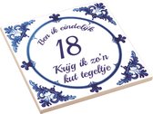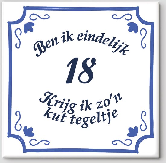 La tuile sort avec le texte 18 ans est une tuile unique à accrocher au mur. Ce carreau est fait de céramique et a une finition de haute qualité. Il a une belle couleur blanche et une bordure de Delft Blauw avec le texte "Ben enfin 18 ans, je reçois une telle tuile de con". Un cadeau unique avec humour pour un 17ème anniversaire. Vous recevrez le carreau emballé dans de la mousse dans une boîte en carton qui tient dans la boîte aux lettres.