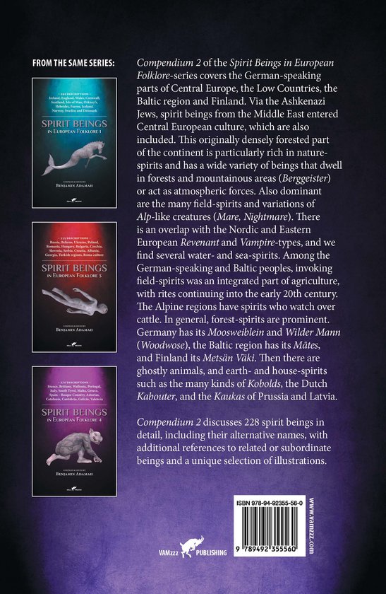 Compendium 2 of the Spirit Beings in European Folklore-series covers the German-speaking parts of Central Europe, the Low Countries, the Baltic region and Finland. Via the Ashkenazi Jews, spirit beings from the Middle East entered Central European culture, which are also included. This originally densely forested part of the continent is particularly rich in nature-spirits and has a wide variety of beings that dwell in forests and mountainous areas (Berggeister) or act as atmospheric forces. Also dominant are the many field-spirits and variations of Alp-like creatures (Mare, Nightmare). There is an overlap with the Nordic and Eastern European Revenant and Vampire-types, and we find several water- and sea-spirits. Among the German-speaking and Baltic peoples, invoking field-spirits was an integrated part of agriculture, with rites continuing into the early 20th century. The Alpine regions have spirits who watch over cattle. In general, forest-spirits are prominent. Germany has its Moosweiblein and Wilder Mann (Woodwose), the Baltic region has its Mātes, and Finland its Metsän Väki. Then there are ghostly animals, and earth- and house-spirits such as the many kinds of Kobolds, the Dutch Kabouter, and the Kaukas of Prussia and Latvia. Compendium 2 discusses 228 spirit beings in detail, including their alternative names, with additional references to related or subordinate beings and a unique selection of illustrations.