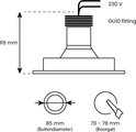 Vous devez placer cet endroit Profondeur d'installation de 115 mm requis, cela inclut l'épaisseur de la finition de votre plafond. Si vous avez une plaque de plâtre de 10 mm, vous devriez avoir 105 mm d'espace libre dans votre plafond suspendu. être. Si vous avez ou allez placer un matériau isolant au-dessus du projecteur, nous vous conseillons de choisir le luminaire avec espaceur choisir. Ensuite, vous avez une distance suffisante entre la lampe et le matériau isolant et la lampe dispose d'un espace de refroidissement suffisant.