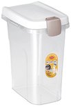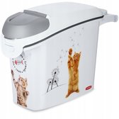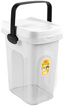 Ce baril d'alimentation est très agréable, étroit et très facile à déplacer grâce aux roues. Je donne à mes chiens des croquettes qui se présentent en sac de 8 kg, ça rentre facilement, je peux donc commander de nieuw croquettes plus rapidement pour que le stock reste optimal. Le récipient se ferme très bien donc les aliments restent bons longtemps. J'en suis content!