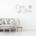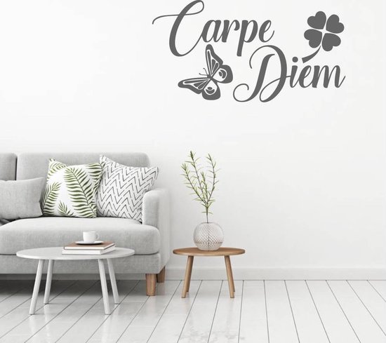 Sticker Muursticker Carpe Diem Avec Papillon Et Trèfle à Quatre Feuilles - Gris Foncé - 160 x 80 cm - Salon Chambre Textes Anglais - Muursticker4Sale