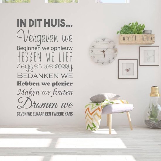 Pour chaque maison, il est précieux d'obtenir cet autocollant mural spécial avec les règles de la maison. L'autocollant mural est fourni avec des règles qui garantissent que tout le monde dans la maison interagit de manière amusante et honnête. Ce sticker mural est précieux pour une pièce comme le salon et la cuisine. C'est un sticker mural qui mérite l'attention tous les jours. Placer un autocollant mural peut garantir qu'une pièce est dotée d'un beau nouveau look en quelques minutes. Vous pouvez commander l'autocollant mural en différentes couleurs et tailles afin que l'autocollant s'intègre bien au reste de votre intérieur.