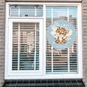 est collé sur une fenêtre à l'extérieur, l'autocollant de naissance est donc résistant aux intempéries.