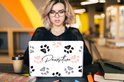 La citation : Restez pawsitive complété par des empreintes de pattes aux couleurs pastel. .