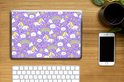 Motif de licornes, arcs-en-ciel et bonbons sur fond violet.