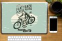 Dessin rétro d'un homme sur une moto. Les lettres noires énoncent la citation « course de classification sur piste plate n° 1 ».