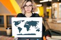 Wereldkaart composée de petites formes de couleur bleue. La carte ressort bien sur le fond blanc.