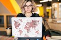 Cette carte du monde est faite avec de la peinture et a des tons roses et gris. Les noms des différentes zones sont également affichés en blanc.Spécifications produit
