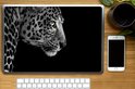 Léopard avec une garde noire et blanche et des yeux jaune pâle sur fond noir.Spécifications produit