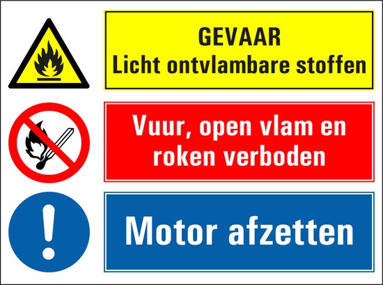 Vous pouvez utiliser le panneau Substances hautement inflammables, flamme nue et interdiction de fumer, arrêter le moteur pour indiquer qu'il existe un danger de substances hautement inflammables. Le panneau indique également que le feu, les flammes nues et le tabagisme sont interdits ici et que le moteur doit être éteint ici.