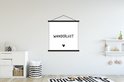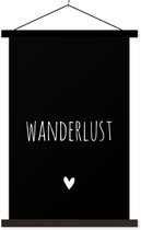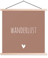 Support pour affiche avec affiche 90 x 90 cm - Affiche scolaire - Citation anglaise « Wanderlust » avec un cœur sur fond blanc - Affiche textile - Lattes noires