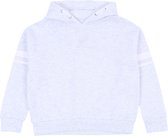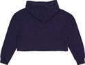 Sweat court bleu marine à manches longues et capuche, tiré sur la tête.