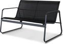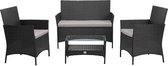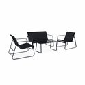 Le salon de jardin 4 personnes Silvi est composé de 2 fauteuils, d'un canapé deux places et d'une table avec plateau en verre. Grâce à la structure en métal noir et aux sièges robustes en textilène, il présente un look élégant et moderne.