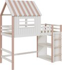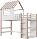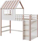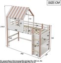 Sweiko Lit d'enfant 90 x 200 cm, lit de fille haut et bas, lit familial, échelle de sécurité avec boîte de rangement, lit multifonctionnel en forme de toit, lit en bois Massief avec cadre plat en forme de nouilles, rose (Geen matelas)