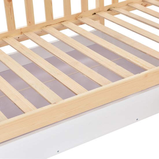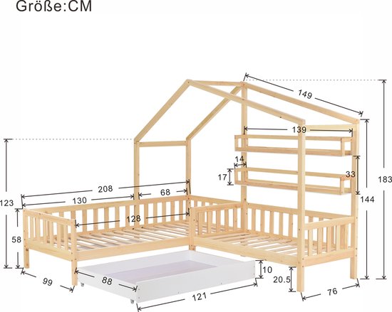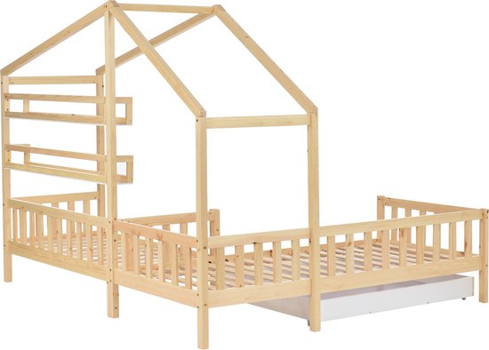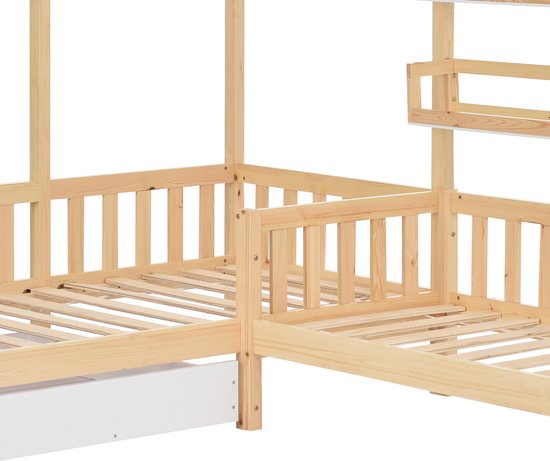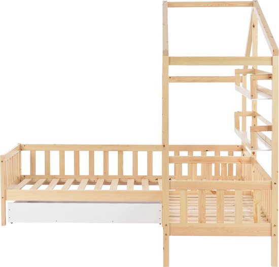 Sweiko Lit enfant, Lit superposé, Lit cabane avec tiroirs et étagères, bois massif avec clôture et construction à lattes, structure en L, Naturel (90x200cm+140x70cm)