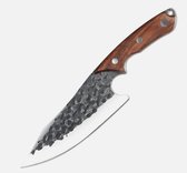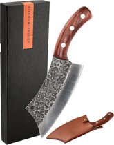 Ce couteau robuste est en grande partie fait à la main et forgé de manière traditionnelle, créant ainsi un beau design unique sur le couteau. La hache à découper est fabriquée dans le meilleur acier forgé sur un noyau en acier dur. Le manche est en beau bois foncé caractéristique.
