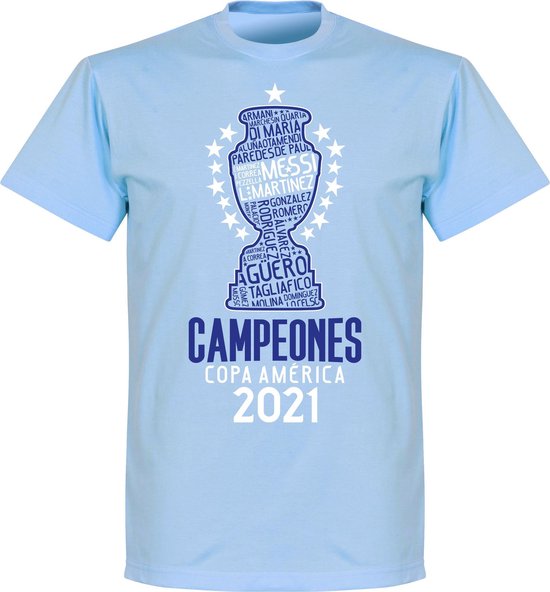 Voici le t-shirt des gagnants de Retake Argentina Copa America 2021 pour adultes. Il s'agit d'un t-shirt spécial en l'honneur de remporter la Copa America en 2021. Le t-shirt est bleu clair et a une image du trophée de la Copa America au milieu, complètement dans le style des couleurs argentines : bleu et blanc. Le trophée contient les noms de tous les joueurs vedettes de l'équipe nationale. Les étoiles autour de la coupe font référence à l'armoire à trophées de l'équipe nationale. Sous la coupe se trouve le texte : ‚Äò‚ÄôCampeones ‚Äì Copa America 2020.‚Äô‚Äô Le t-shirt a également une encolure ronde. T-shirt idéal pour encourager l'équipe nationale de football argentine. Idéal pour les vêtements décontractés. 100% coton.