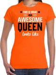 T-shirt Fête du Roi Bellatio Decorations pour femme. jolie chemise imprimée avec le texte : Voici à quoi ressemble une reine géniale. Complétez votre outfit de la Fête du Roi avec ce t-shirt orange ! Matière: 150 grammes, 100% coton. Attention : cet article taille petit, nous vous recommandons de commander een maat au-dessus.