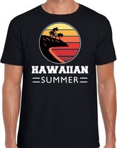 T-shirt / vêtement d'été Hawaii noir pour homme. Cette chemise noire est imprimée du texte : Hawaii summer. Joli t-shirt à porter en outfit pour un club de plage / été à thème tropical, une party été, des vacances, une fête sur la plage ou une party sur la plage tropicale. Aussi agréable à offrir en cadeau à quelqu'un qui envisage Hawaï comme destination de vacances. Déguisement beach club party / t-shirts carnaval pour un été tropical / estival.Matière : 150 grammes, 100% coton.