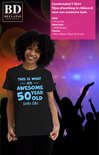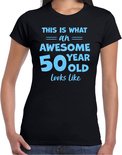 T-shirt habillé pour femme en noir avec imprimé pailleté en bleu. Célébrez l'étape spéciale des 50 ans avec ce T-shirt déguisé spécialement pour l'anniversaire de Sarah ! Ce T-shirt festif avec le texte "Voici à quoi ressemble un génial 50 ans" en lettres scintillantes et élégantes est idéal pour mettre Sarah, la fille d'anniversaire, à l'honneur. Perfect pour les fêtes d'anniversaire et les moments de plaisir entre amis et en famille. Laissez Sarah briller à l'occasion de ses 50 ans avec ce T-shirt, un cadeau parfait pour célébrer cet événement avec style ! Matériel: 145 grammes, 100% coton. Merk: Bellatio Decorations.