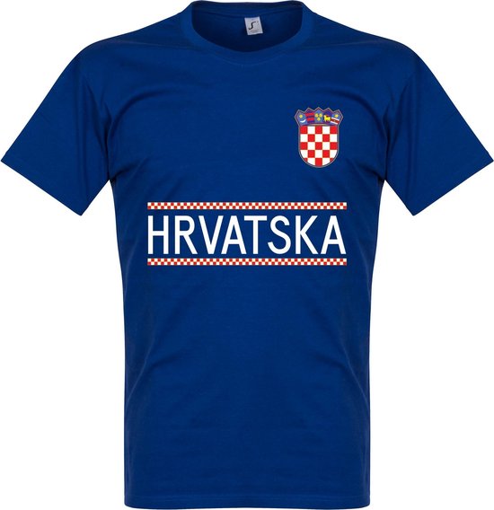 Magnifique t-shirt Croatie bleu de Retake. Ce t-shirt est complètement dans le style de la couleur du maillot de football de la Croatie et est principalement bleu avec un col rond. Au milieu du t-shirt se trouve le nom du pays: HRVATSKA. La poitrine gauche est équipée d'une impression d'un logo vintage de la fédération de football du pays. T-shirt idéal pour encourager l'équipe nationale de Croatie dans les grands tournois comme une Coupe du Monde ou un Championnat d'Europe. Parfait pour une tenue décontractée ! 100% coton.