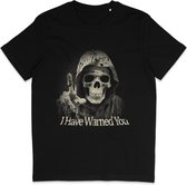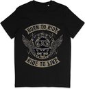 T-shirt pour motocyclistes. Crâne et citation : Born to Ride, Ride to Life. Unisexe, femmes et hommes. Manches courtes, col rond, 100% coton biologique.