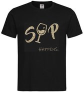 T-shirt unisexe Adultes Fun - carnaval - foire - fête - drôle - week-end - Vin - texte "Sip happens" sur le devant | manche courte | Zwart/ Champagne Or Goud | taille M
