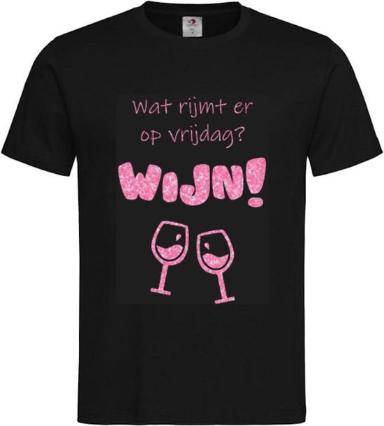 T-shirt Unisexe Adultes Fun - carnaval - foire - fête - drôle - week-end Texte "Qu'est-ce qui rime avec vendredi ? Vin!" Sur le devant | manche courte | Zwart/rose à paillettes | taille S
