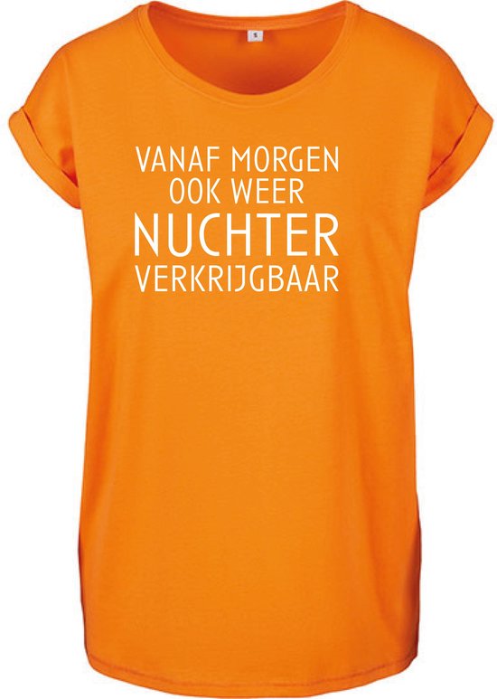 Un t-shirt pour femme avec un imprimé et le texte From Tomorrow Also Weather Sober Disponible pour des activités orange amusantes, parfait pour la fête du Roi, la Coupe du monde de Voetbal et bien plus encore, Fabriqué en 95 % Katoen et 5 % élasthanne et disponible en différentes couleurs