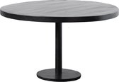 Table à manger Palermo avec plateau rond en bois de manguier finition noire d'un diamètre de 110 cm. et 1 pied rond noir sur une plaque de base ronde extra robuste.