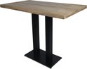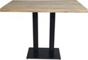 Table bar Palermo avec plateau en bois de manguier de 160 x 80 cm laqué couleur naturelle et 2 pieds noirs sur plaque de base.
