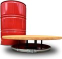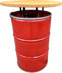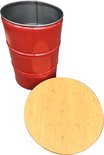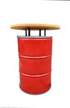 Table debout industrielle / poubelle 2 en 1 Barrelkings| Baril d'huile en métal 200 Litres rouge Poubelle / Prullenbak 200 Litres avec couvercle troué | Table de bar / Table suspendue avec plateau en bois laqué. 80 cm / 105 cm Contenu 200 litres.