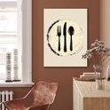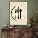 Une fourchette, un couteau et une cuillère sont représentés graphiquement dans un style de silhouette noire sur un fond beige. Les bords bruts et éclaboussés donnent au design un aspect imprimé à la main ou au pochoir, créant une ambiance ludique et artistique...