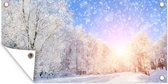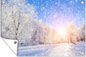 Une belle photo d'une forêt enneigée avec le soleil qui brille magnifiquement. Egayez votre jardin avec ce poster de jardin !