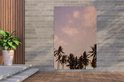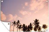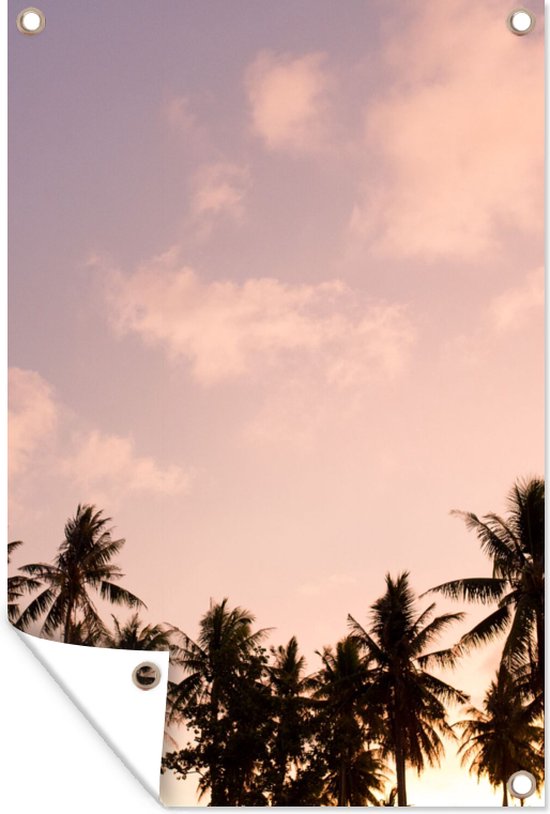 Décorez votre jardin avec cette toile de jardin d'été ! L'affiche de jardin montre des palmiers sous un ciel pastel.