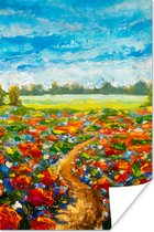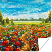 Peinture d'un champ de fleurs rouges.