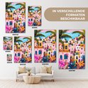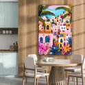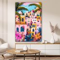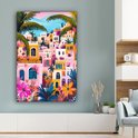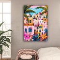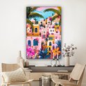 Une scène pittoresque de maisons colorées en rose, orange et jaune, entourées de plantes à fleurs et de palmiers. La composition joyeuse rayonne de chaleur et de confort.