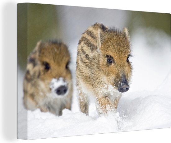 Deux sangliers rayés se frayent un chemin à travers l'épaisse couche de neige de la ville allemande de Hesse. Cette image prend tout son sens à l'intérieur du salon ou de la chambre des enfants.