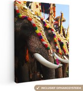 Une longue file d'éléphants alignés pour un défilé. Les éléphants sont habillés d'un équipement très élaboré allant d'un tissu sur le tronc à un siège pour les cavaliers.