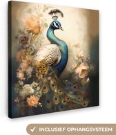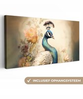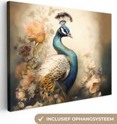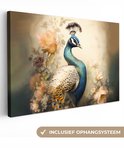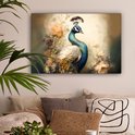 Tableau sur toile Paon - Plumes de paon - Fleurs - Vogels - Botanique - 60x40 cm - Décoration murale