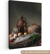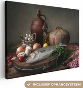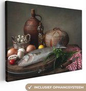 Toile Peinture Rustique - Poisson - Nature Morte - Légumes - Herbes - 160x120 cm - Décoration murale XXL