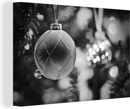 Tableau sur toile Un gros plan de décorations de Noël décoratives près d'un sapin de Noël - noir et blanc - 30x20 cm - Décoration murale de Noël pour l'intérieur - Décoration de Noël Salon - Décoration de Noël à la maison