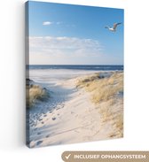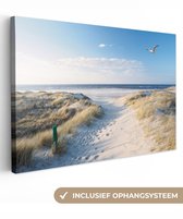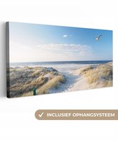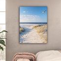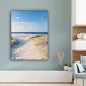 Une mouette survole les dunes avec des battements d'ailes rapides. Un chemin de sable mène à travers les dunes jusqu'à la mer. Profitez de la mer tous les jours en accrochant ce tableau sur toile dans le salon, la chambre ou le bureau !