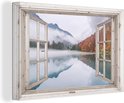 Fenêtre donnant sur une forêt d'automne sur l'eau.