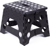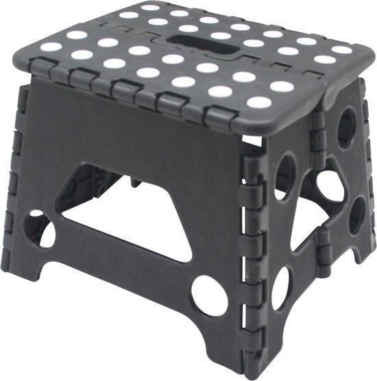 Tabouret pliant pratique. Ce tabouret est très approprié pour servir de marche par exemple dans la cuisine. Est entièrement pliable, ce qui le rend facile à ranger. Le tabouret est noir avec du blanc et peut supporter un poids maximum de 80 kg.