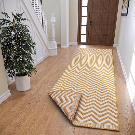 Tapis réversible tissé plat design géométrique pour intérieur et extérieur - Oeko-Tex, résistant aux intempéries, résistant aux UV - ocre - 80 x 250 cm