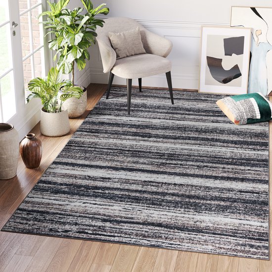C'est vraiment un beau tapis. Je pense que c'est plus joli que sur la photo. Il est aussi beaucoup plus clair que l'image, il y a beaucoup plus de blanc laine au niveau des rayures/lignes avec le noir et l'anthracite ; l'anthracite a parfois aussi une teinte bleuâtre foncée, sinon il est joliment mélangé ; quelle belle robe c'est ! Il a aussi vraiment un aspect coton/lin et il ne brille pas du tout. Le dos antidérapant est également très agréable, ce qui permet au tapis de bien s'adapter. Lorsque vous le posez, il doit encore s'étaler un peu après sa sortie de l'emballage, mais il est aussi très beau. En bref : personnellement, je trouve qu'il s'agit d'un très beau tapis qui, malgré les nombreuses lignes, dégage néanmoins une sorte de tranquillité. J'espère qu'il restera beau longtemps !